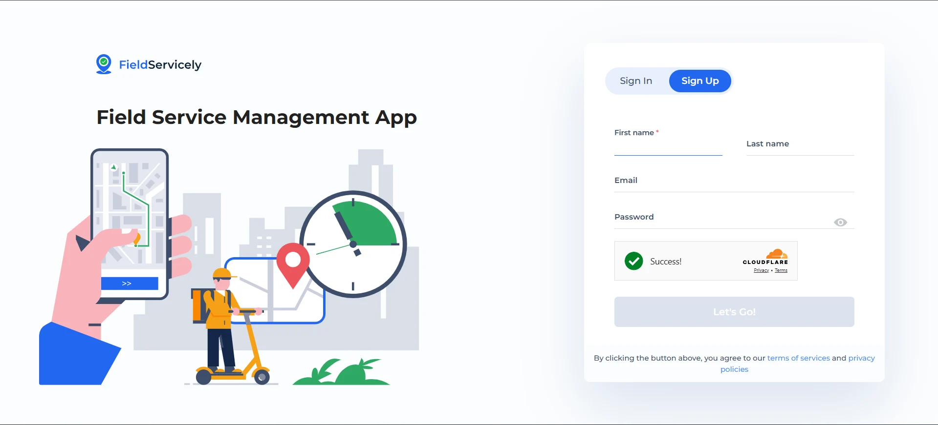 To sign up to FieldServicely, navigate to the sign-up page and supply: