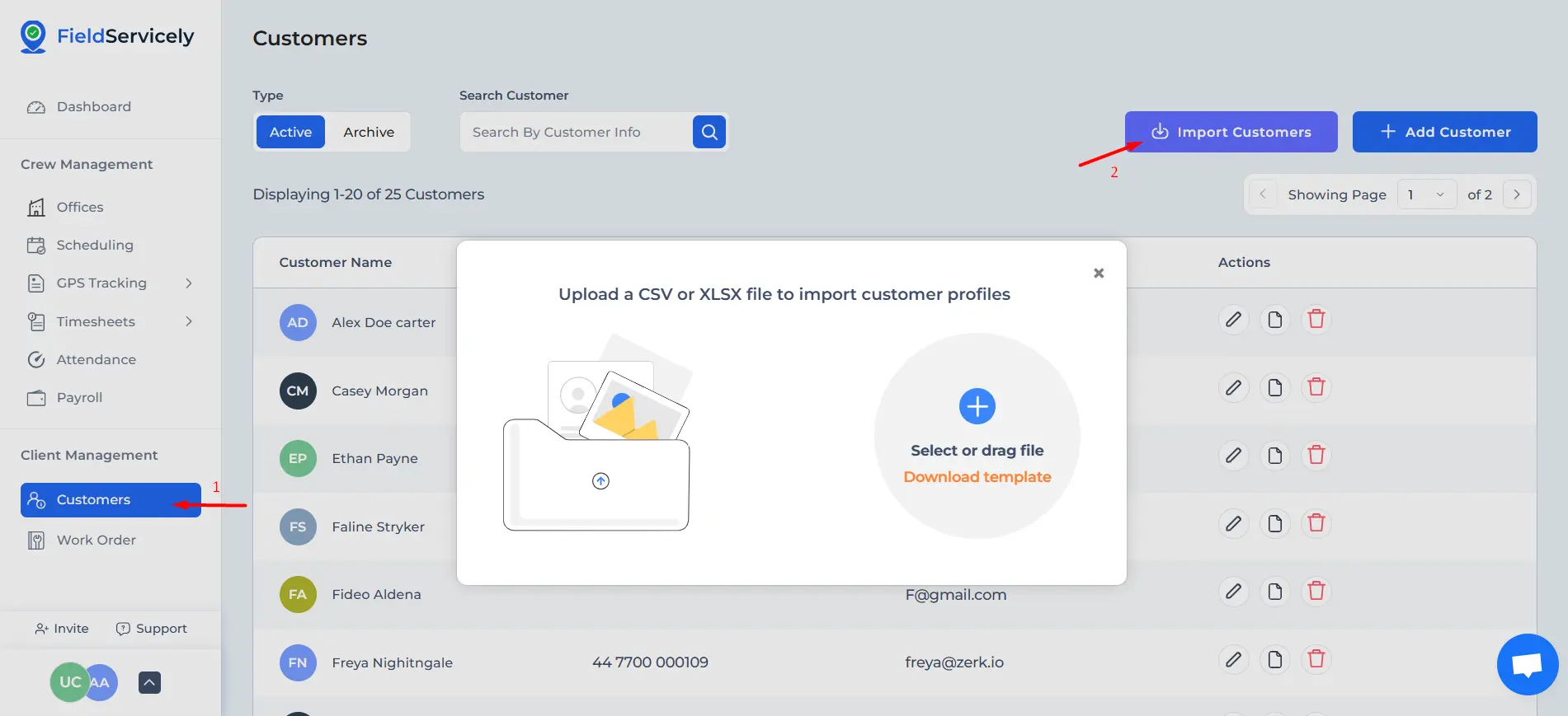 One is to upload a CSV file through ‘Import Customers’ (download our provided template and fill it in first).