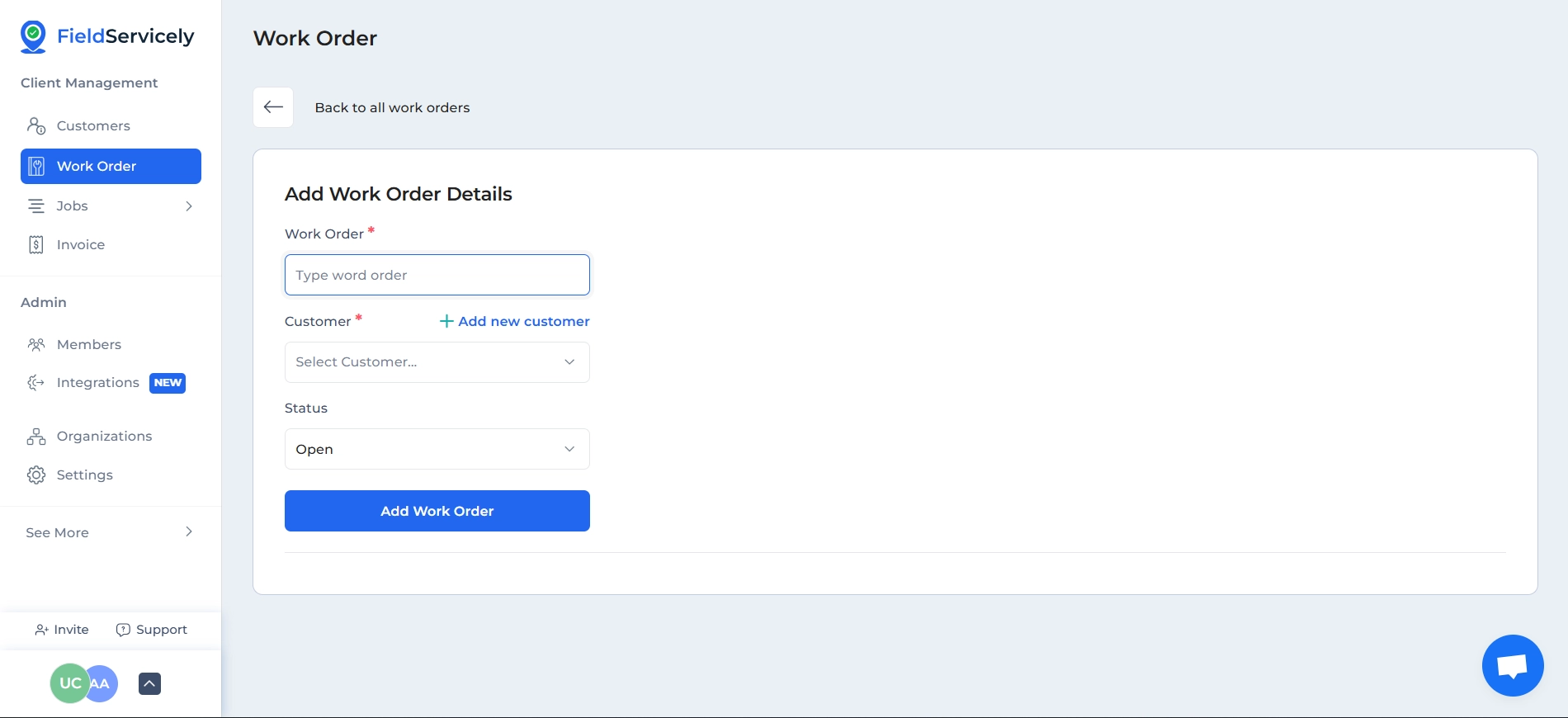 Click on ‘Work Order’ and then click on the ‘+ Create Work Order’ Button on the top right.