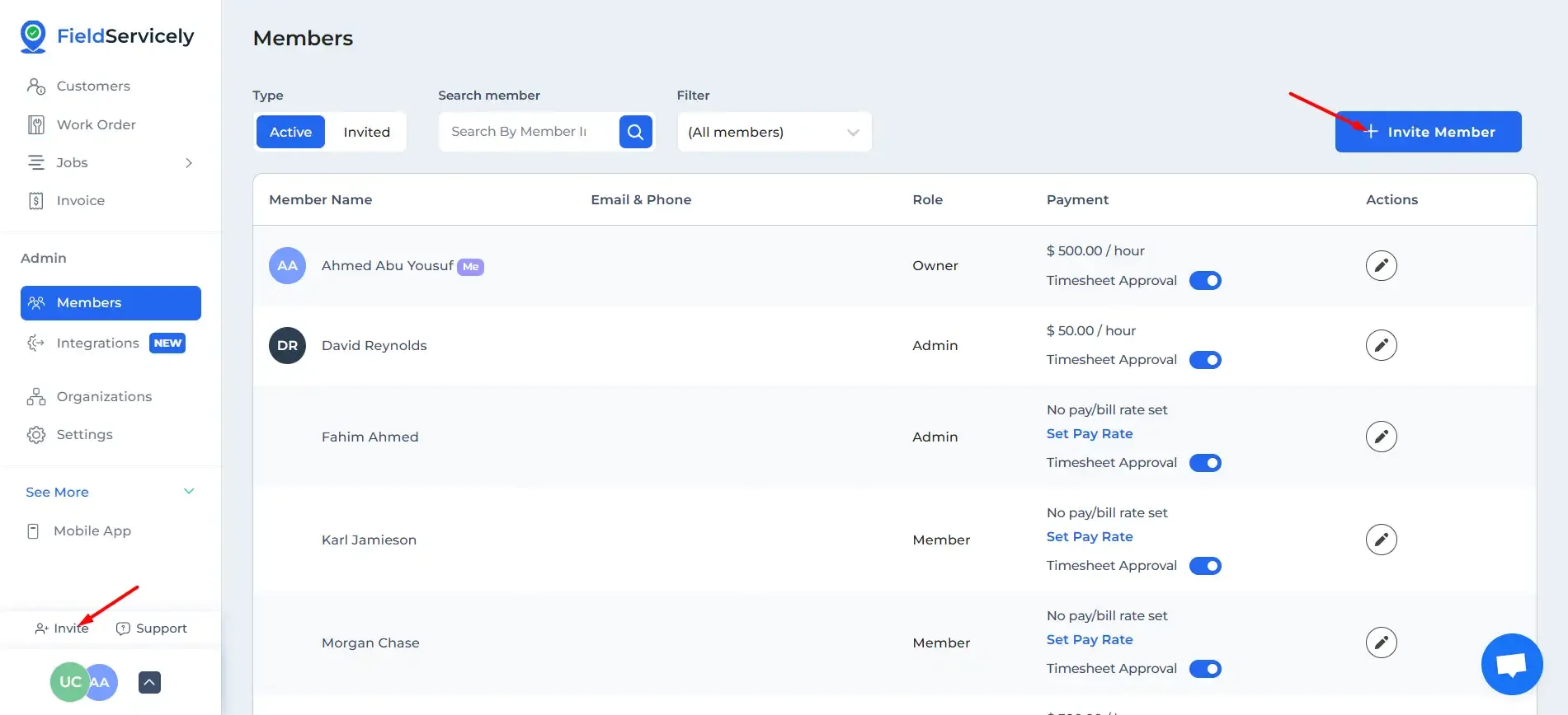 You can also invite Team Members from the ‘Members’ tab on the left sidebar, and the ‘Invite’ option at the bottom of the left sidebar.