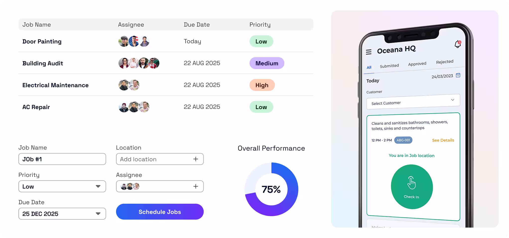 FieldServicely brings everything into one platform: job scheduling, dispatching, real-time GPS tracking, route maps, work order management, attendance (with geofencing and selfies), timesheets, payroll, invoicing, and dashboards.