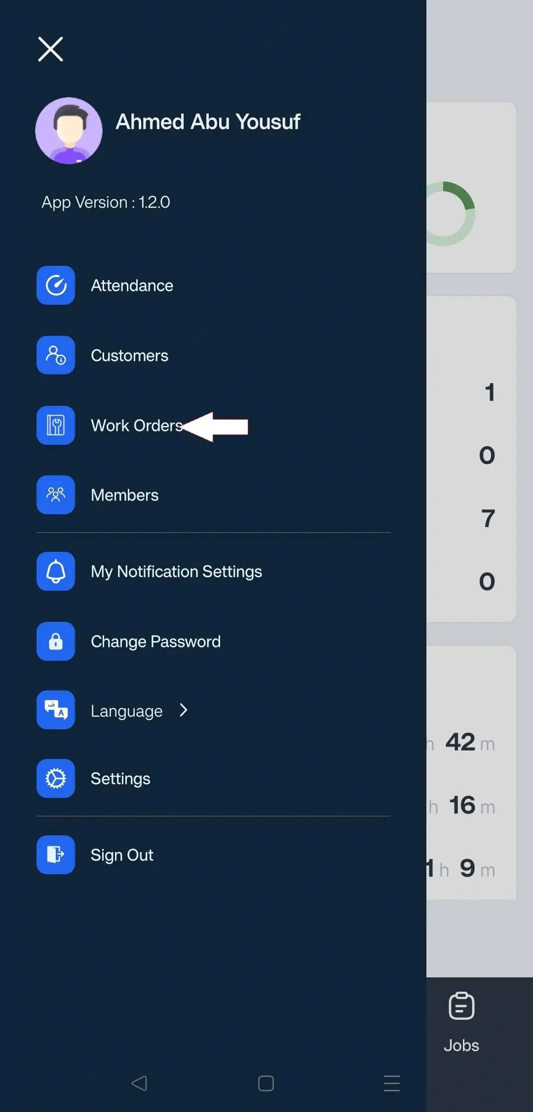 To add a work order from the mobile app, you can either tap on the Add Icon or tap on the ‘Work Order” tab from the side menu and tap on the Add Icon.