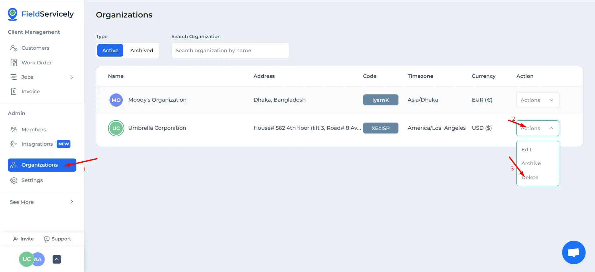 Navigate to ‘Organization’ from the left sidebar..and click on the actions drop-down menu from the right side of the organization you wish to delete, before clicking on delete.
