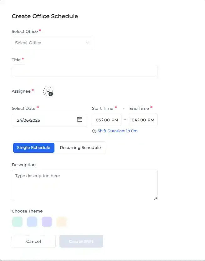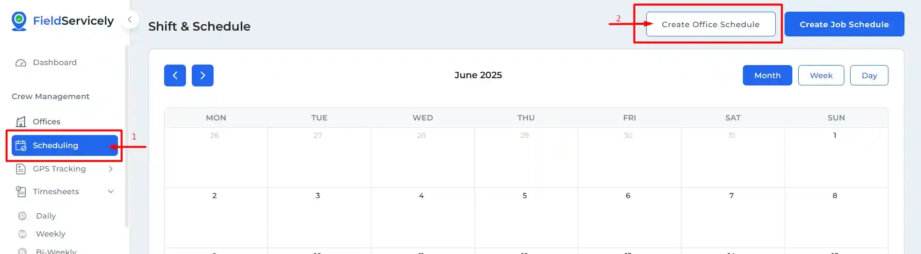 Click on ‘Scheduling’ from the left side bar, and then on ‘Create Office Schedule’ on the top right hand above the calendar.