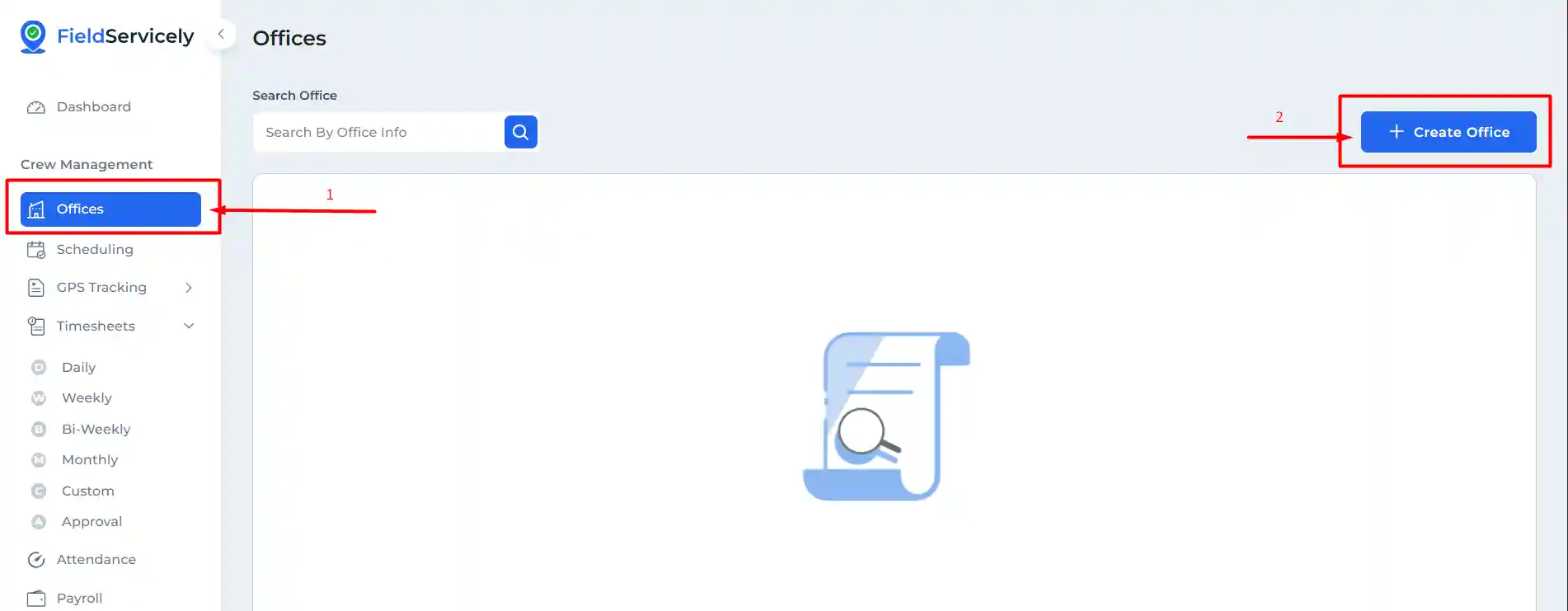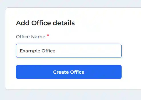 Select ‘Offices’ on the left side bar, and once the module opens click on ‘+ Create Office’ button.