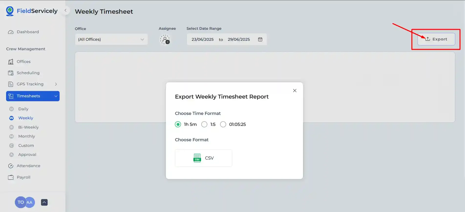 Click on the ‘Export’ button on the top right and choose the time format you wish to download your time sheet in.