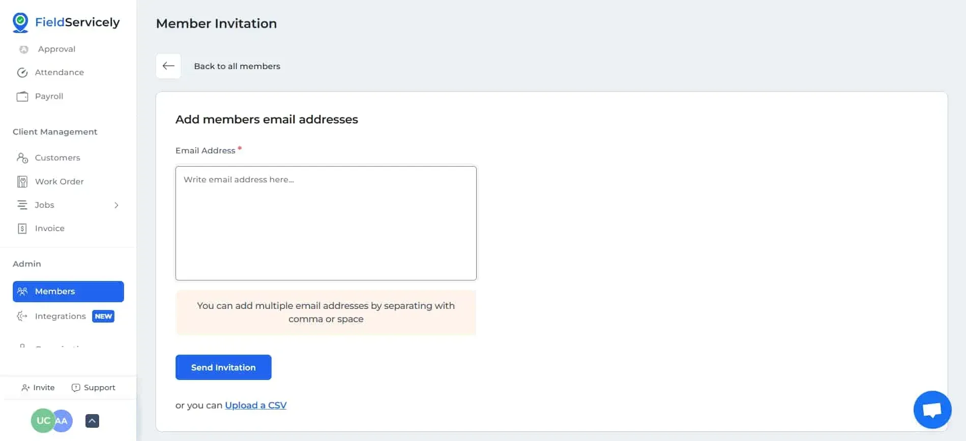 You can either list down all the emails of everyone you want to invite, or upload an CSV file to finish inviting new members.