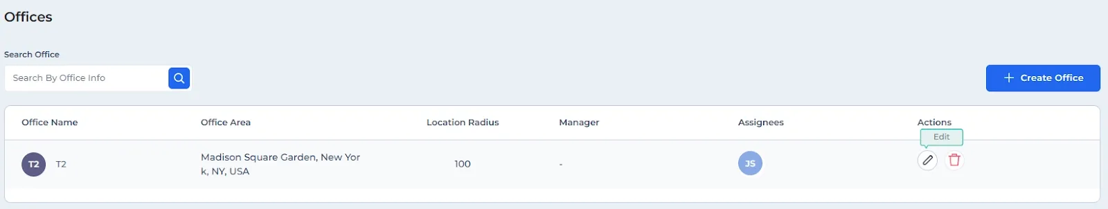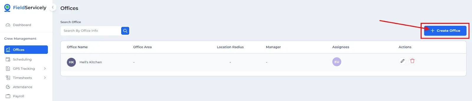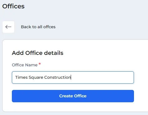 Select “Offices” from the left side panel, from there click on the “+ Create Office” located at the top right corner in order to create a new office. 🏣