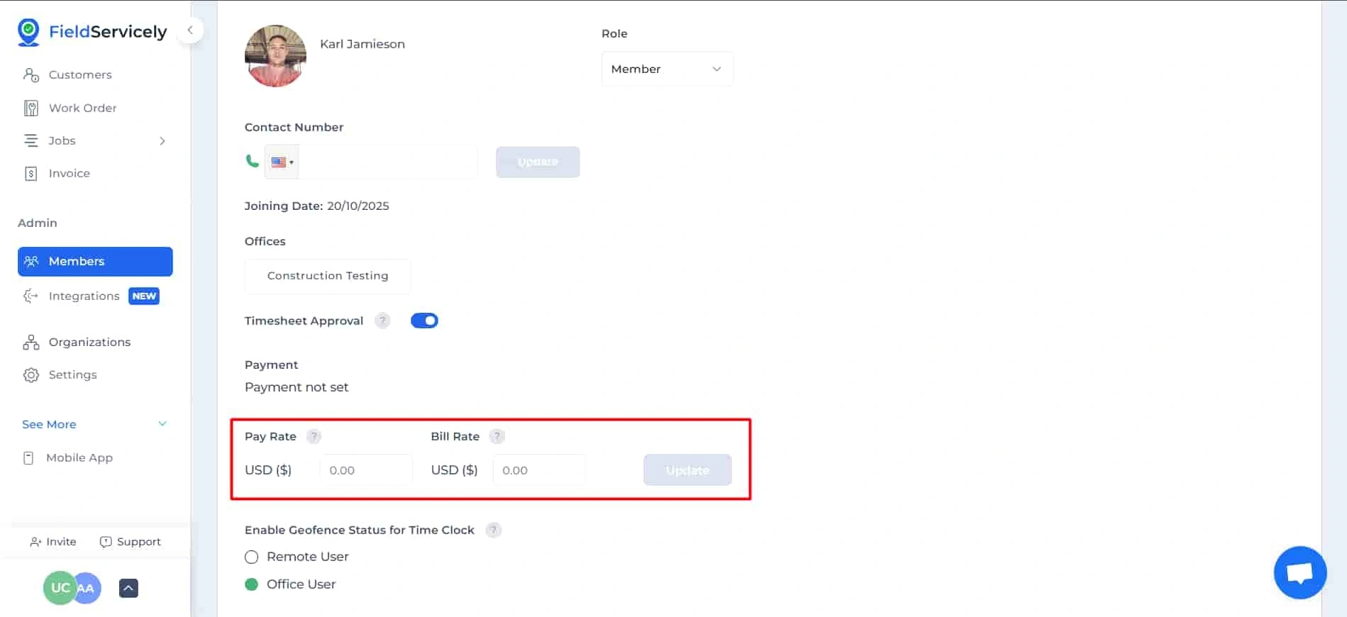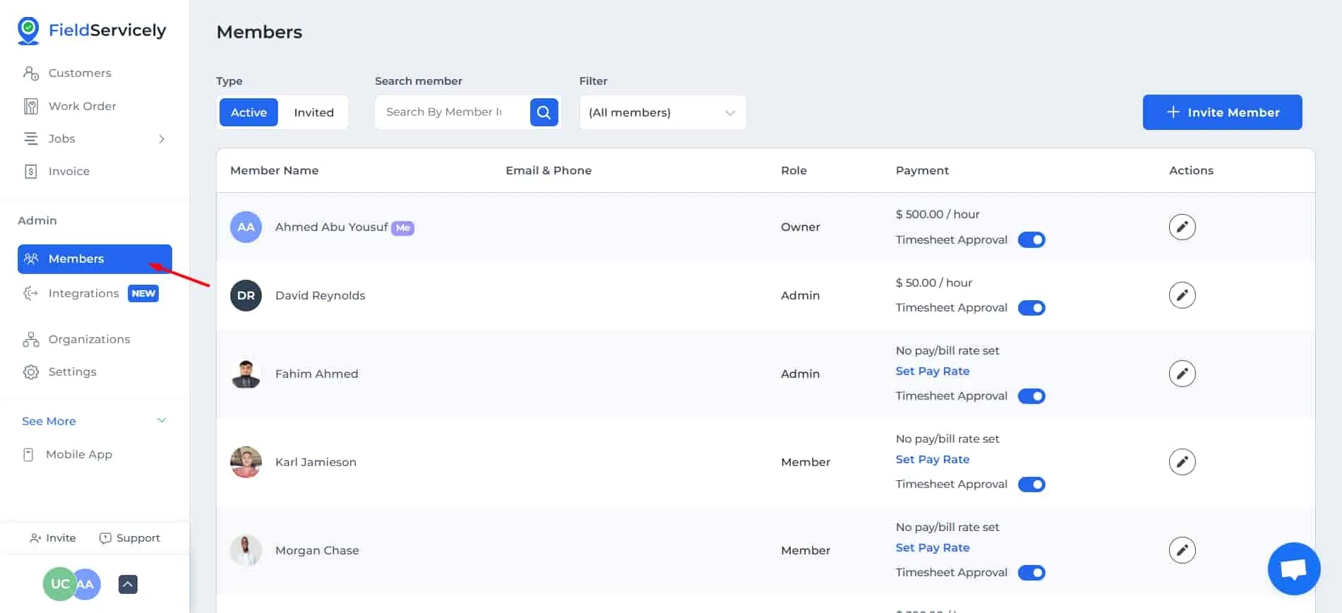 To set the pay rate, go to the Members page.